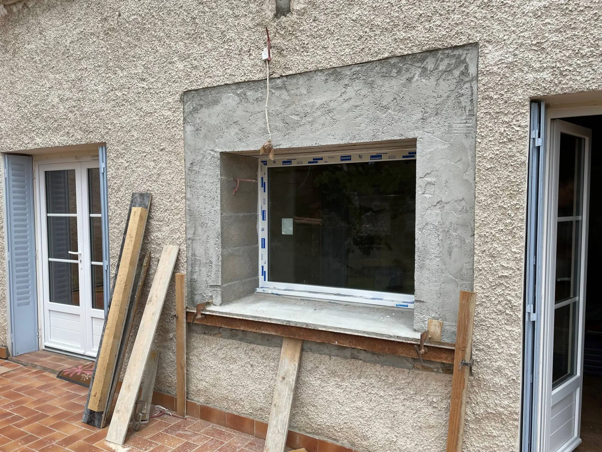 - Après séchage, nous avons procédé à la pose de la menuiserie extérieure de type fenêtre châssis fixe