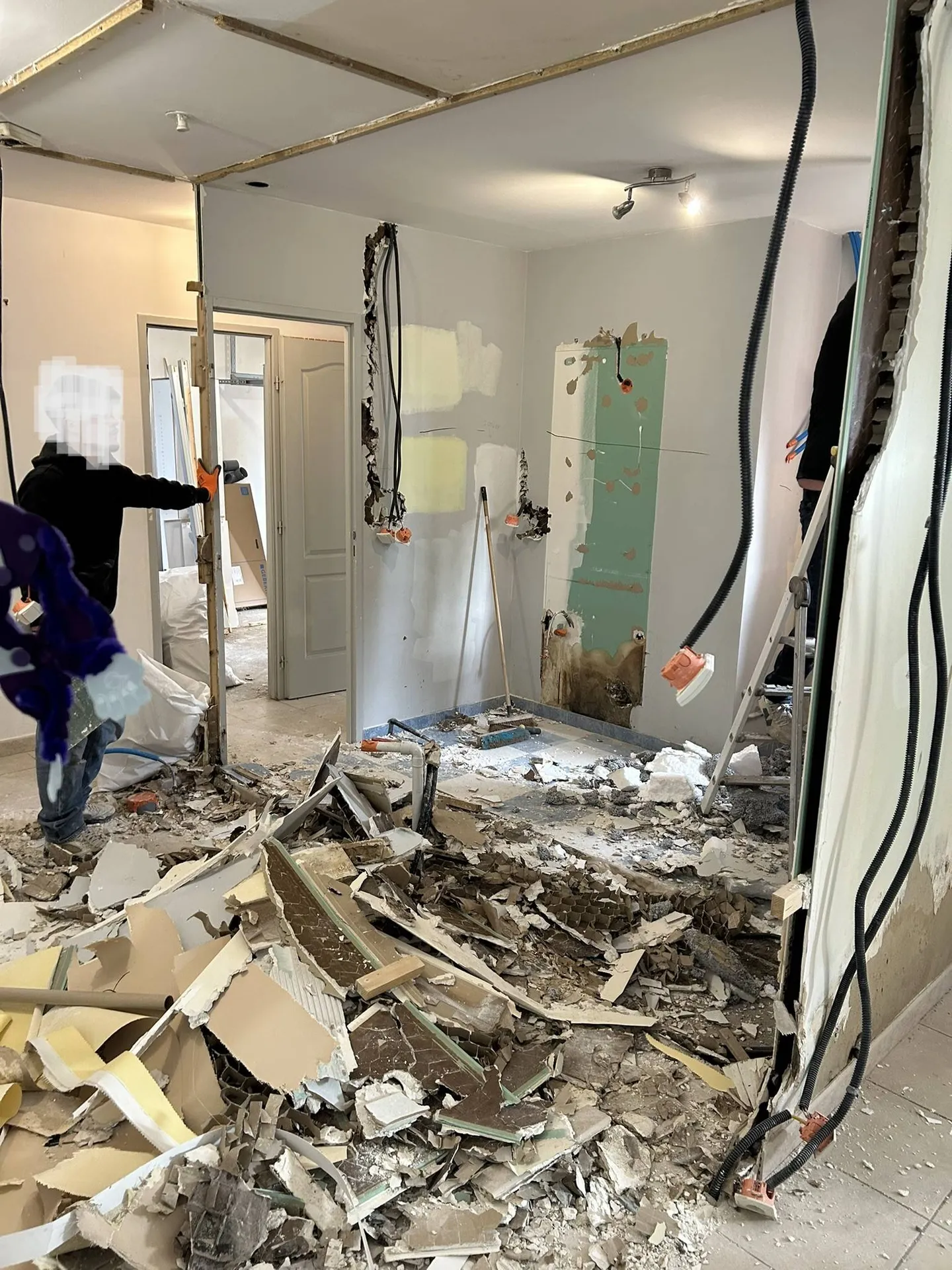 Démolition et dépose : enlèvement des cloisons, doublages, revêtements de sols (parquet, carrelage), plafonds endommagés et éléments sanitaires touchés.
