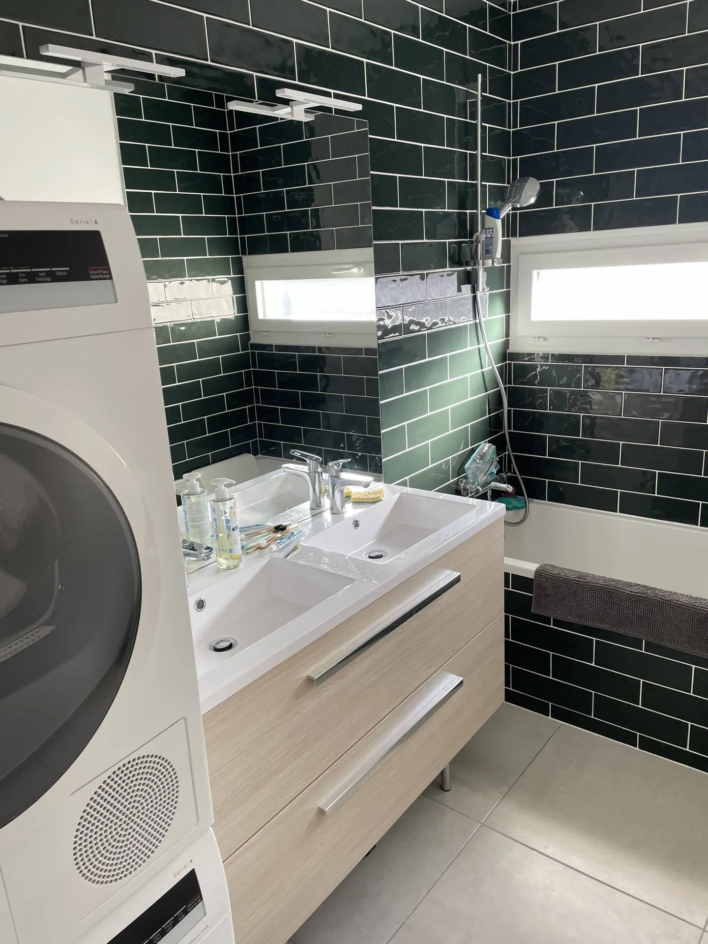 La suppression du bidet lors de la rénovation complète de cette salle de bain a permis l'installation des lave-linge et sèche-linge.